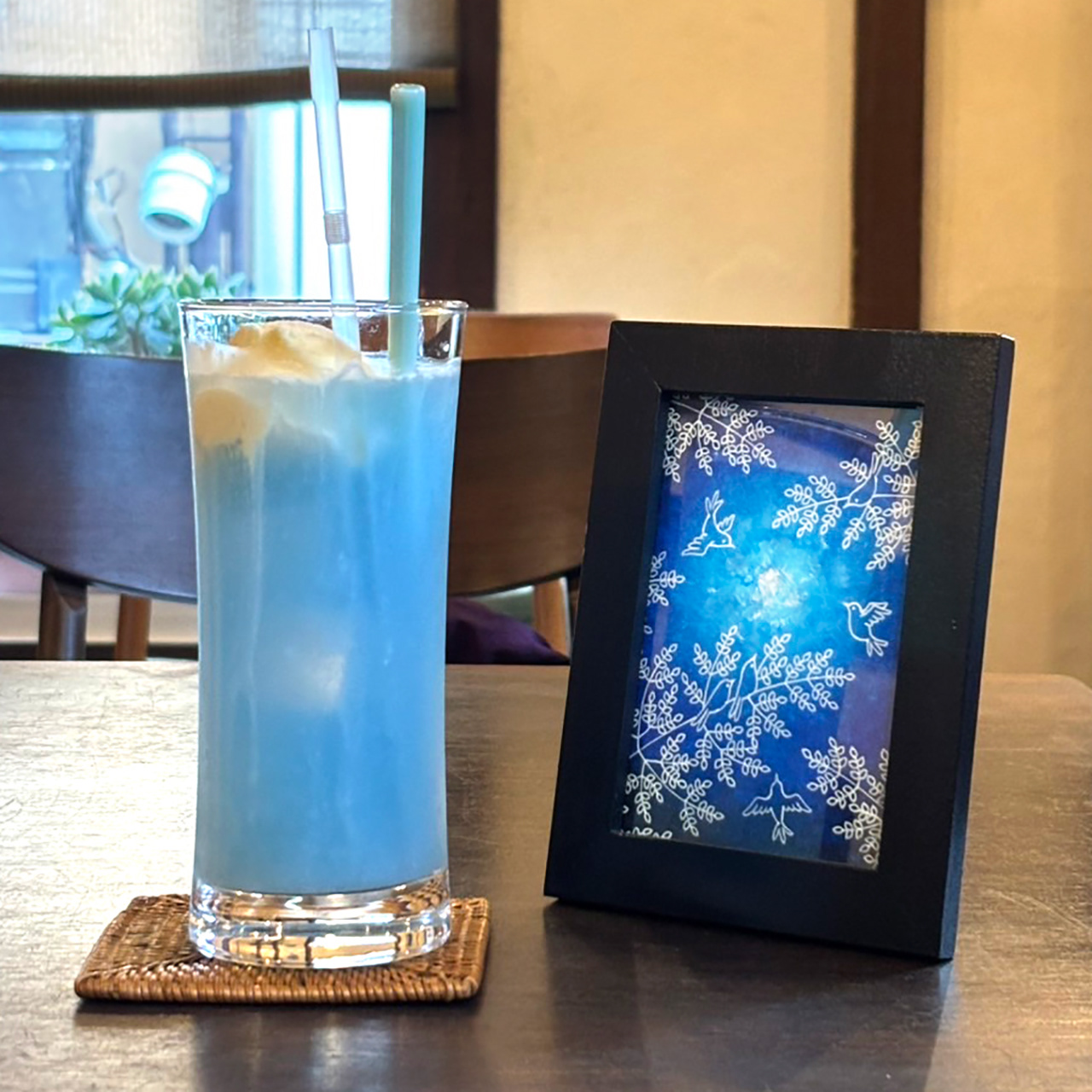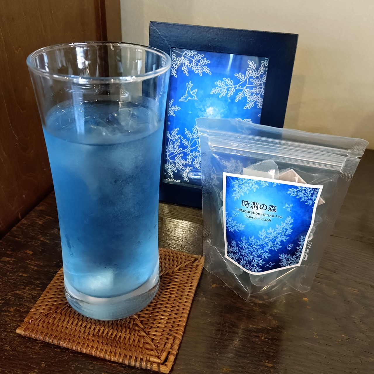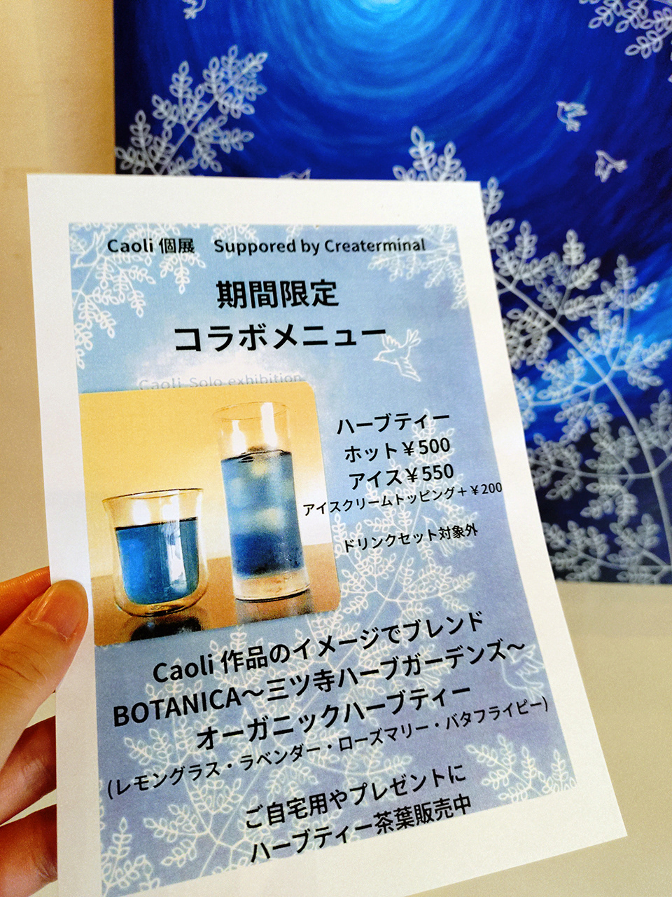 個展期間中、私の作品をイメージした青いハーブティーをコラボメニューとして出していただけることになりました!